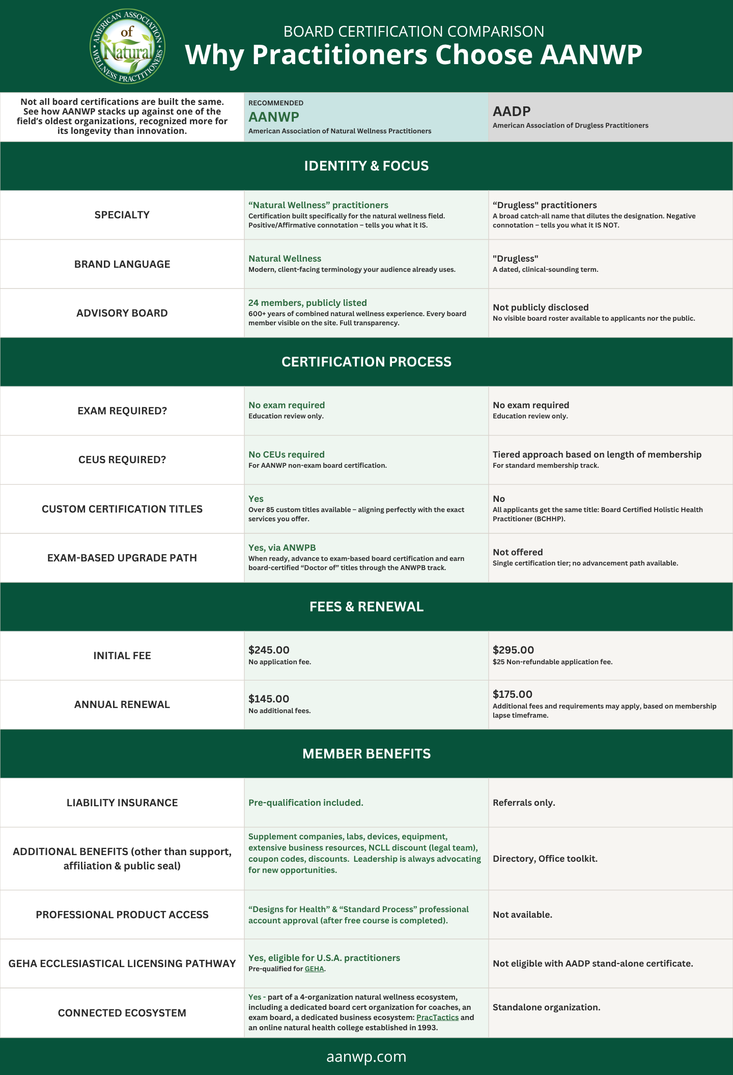 Choosing the right board certification can shape the future of your career as a natural wellness practitioner. While both AANWP and AADP offer board certification paths, this comparison highlights why AANWP stands out as the more modern, practitioner-focused option. From transparent leadership and flexible certification requirements to meaningful professional benefits, AANWP is designed to support real-world success.
